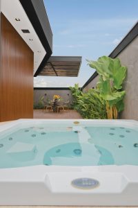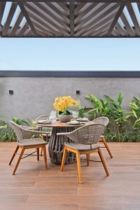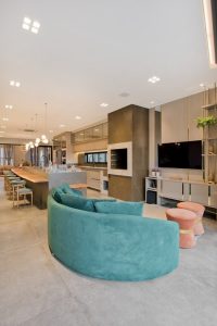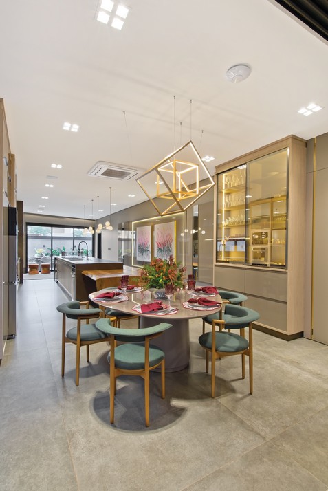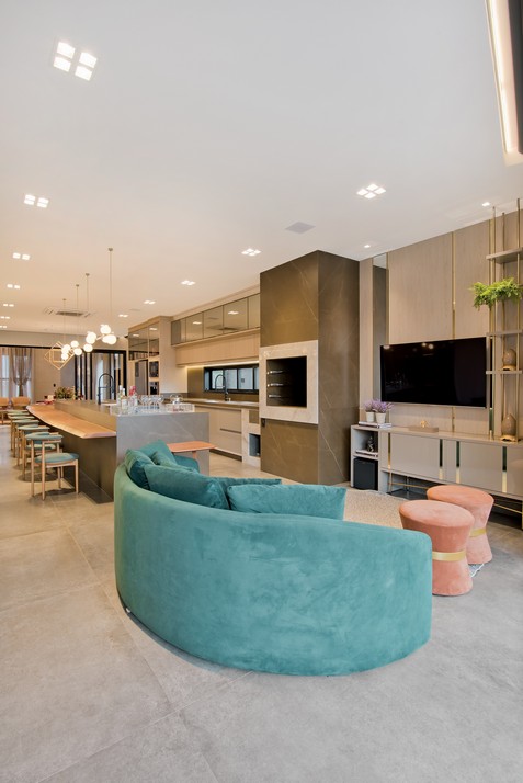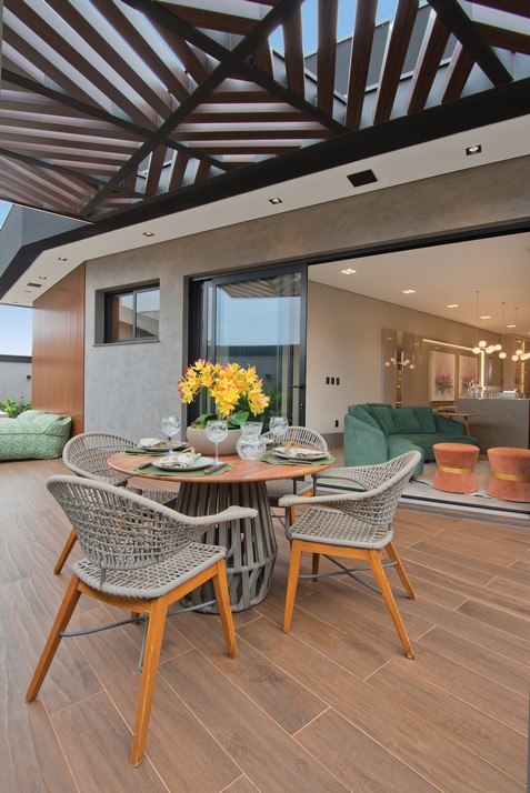 O espaço gourmet, totalmente integrado, foi pensado para receber a família com um toque rústico e acolhedor. O mármore Michelangelo nos pisantes trouxe sofisticação à fachada, enquanto o paisagismo envolve a área de lazer, criando um ambiente harmônico.