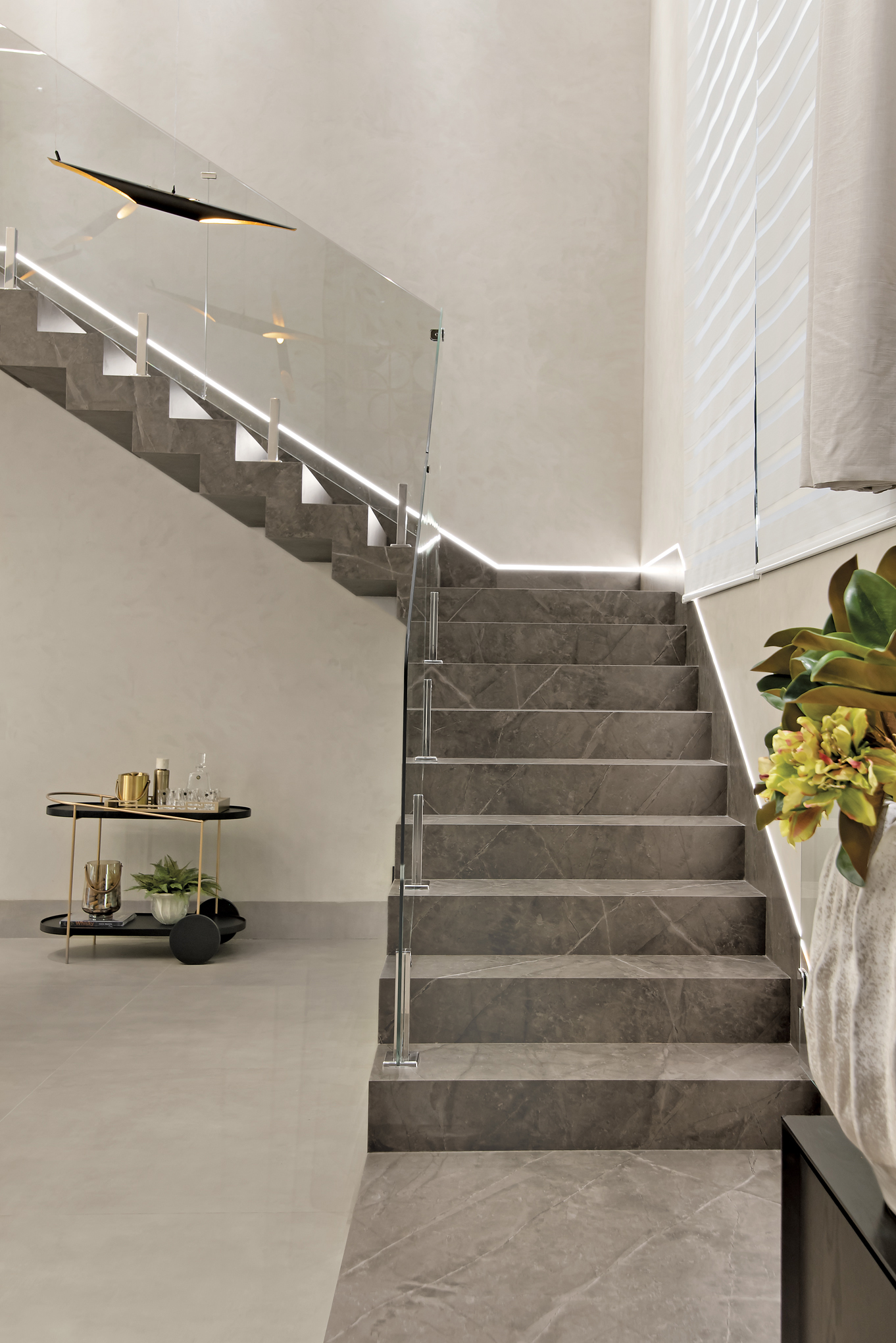 O ponto de partida foi criar uma residência de arquitetura única, com detalhes marcantes e boa iluminação. O uso do “Big Number” e da “Big Door”, marcas registradas de muitos dos nossos projetos, traz o primeiro impacto à fachada contemporânea. Nesta casa em especial, uma porta de grandes dimensões e painéis revestidos com lastras definem a área social, enquanto o cimento queimado equilibra esses elementos, adicionando aconchego aos interiores e destacando as paredes cuidadosamente revestidas. A luz natural e o paisagismo permeiam os ambientes, realçando a composição arquitetônica.